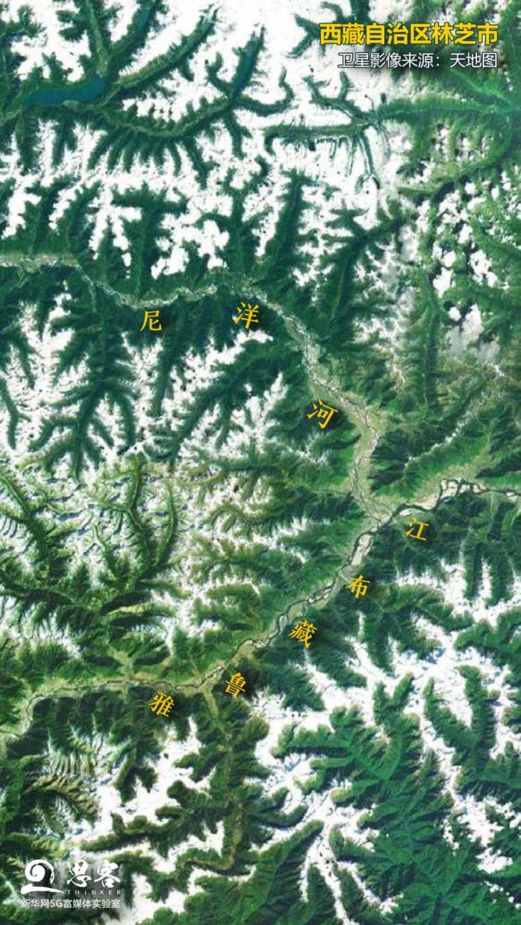 衛(wèi)星視角下的尼洋河與雅魯藏布江,一江一河交匯共同滋潤林芝地區(qū)。衛(wèi)星影像來源:天地圖