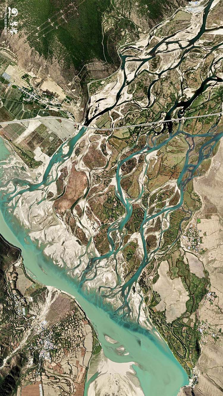 衛(wèi)星視角下的尼洋河辮狀水系。衛(wèi)星影像來源:天地圖
