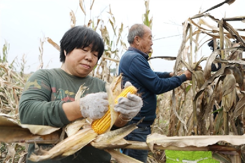10月14日,在平遙縣岳壁鄉(xiāng)西源祠村的農(nóng)耕地里,村民正在搶收玉米。