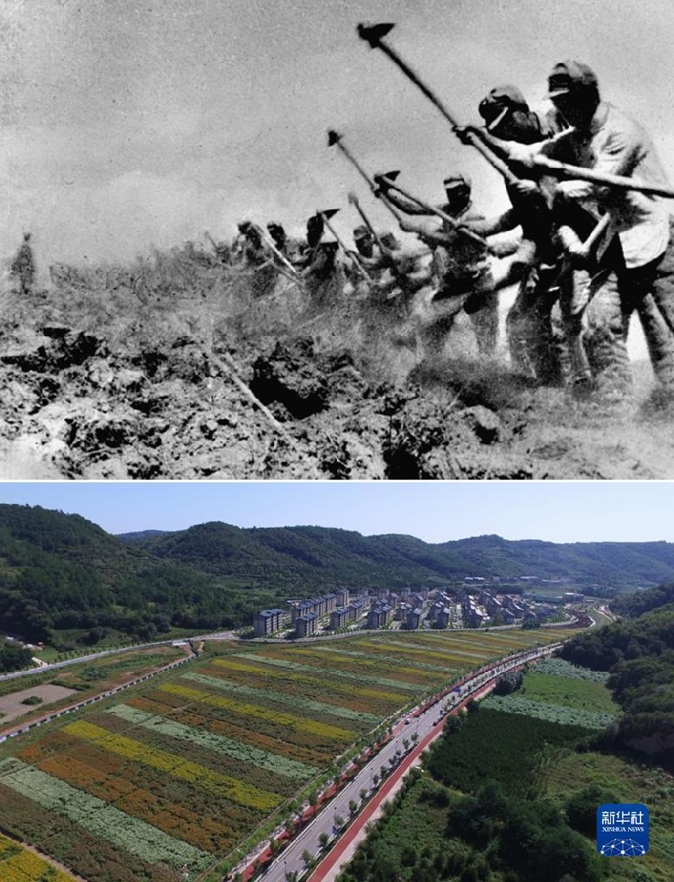 這是一張拼版照片,上圖為:抗日戰(zhàn)爭期間,八路軍三五九旅在南泥灣開荒生產(chǎn)(資料照片);下圖為:2020年8月25日拍攝的延安南泥灣景色(無人機(jī)照片,祁小軍攝)。新華社發(fā)