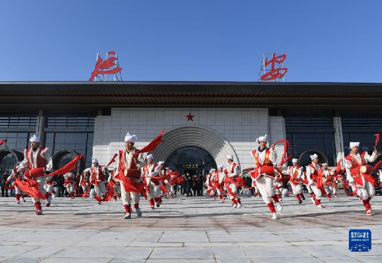 陜西延安南泥灣機(jī)場正式通航,演員在南泥灣機(jī)場進(jìn)行通航慶祝表演(2018年11月8日攝)。新華社記者 張博文 攝