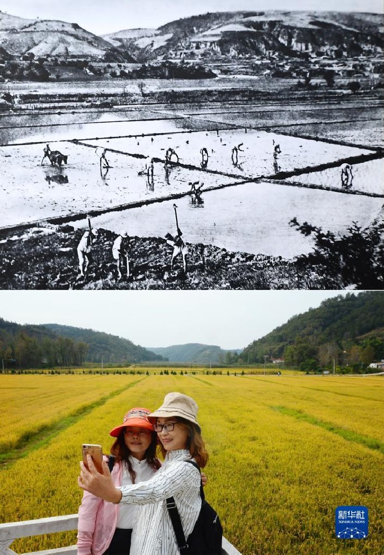 這是一張拼版照片,上圖為抗戰(zhàn)時(shí)期延安南泥灣的生產(chǎn)場景(資料圖片);下圖為2018年9月12日,游客在延安南泥灣稻田旁留影(新華社記者劉瀟攝 )。新華社發(fā)