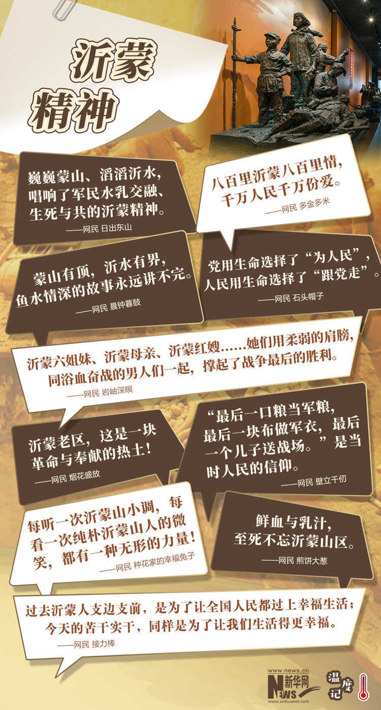 黨為了人民,人民信任黨;黨依靠人民,人民跟黨走。正如網(wǎng)友所說,“蒙山有頂,沂水有界,魚水情深的故事永遠講不完”。今天,誕生于革命戰(zhàn)爭歲月的沂蒙精神早已成為一面旗幟,鼓舞著老區(qū)的人們,干群一心,戰(zhàn)天斗地,苦干實干,頑強不懈,老區(qū)面貌日新月異。接續(xù)傳承沂蒙精神,緊緊拉住人民的手,一切為了人民,一切依靠人民,幸福美好的歌聲將更加悠長。(文字:徐可 海報設(shè)計:王曄)