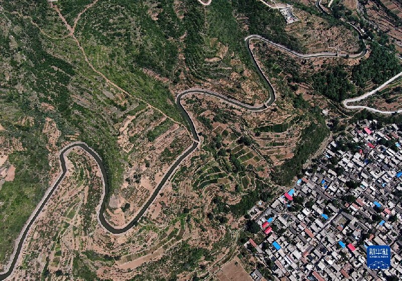紅旗渠總干渠從一座村莊旁繞過(2019年7月5日攝,無人機照片)。新華社記者 李安 攝