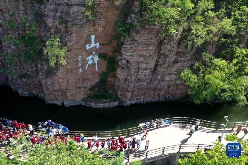 游客在河南林州紅旗渠畔參觀(2019年5月22日攝,無人機照片)。新華社記者 馮大鵬 攝