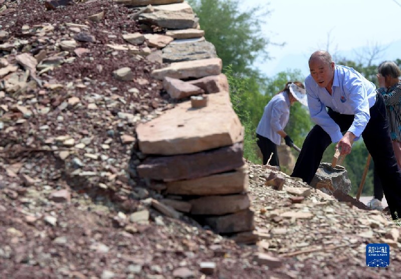 在林州市任村鎮(zhèn)盤龍山村,王生有(前)帶領(lǐng)村民清理亂石,維護道路(2019年7月3日攝)。新華社記者 李安 攝