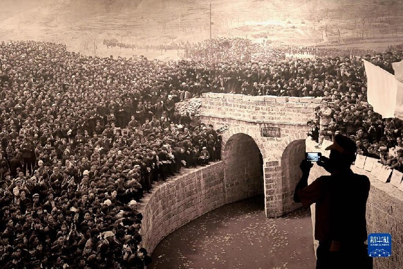 參觀者在紅旗渠紀(jì)念館拍攝展出的紅旗渠通水慶典照片(2019年7月4日攝)。新華社記者 李安 攝