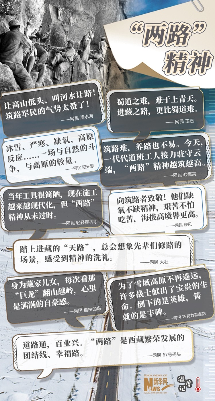 “天路”巍峨,精神閃光。當(dāng)雪域高原換了人間,新一代建設(shè)者正接過(guò)接力棒,在新時(shí)代續(xù)寫(xiě)著新的傳奇?!敖裉?,一代代道班工人接力駐守云端,‘兩路’精神越筑越高”,正如網(wǎng)民所說(shuō),無(wú)論過(guò)去、現(xiàn)在和將來(lái),“兩路”精神都是西藏各族人民建設(shè)幸福家園的力量源泉和精神動(dòng)力,也必將激勵(lì)中華兒女為了更加美好的明天繼續(xù)奮斗、前行。(文字:馬若虎 海報(bào)設(shè)計(jì):王曄)