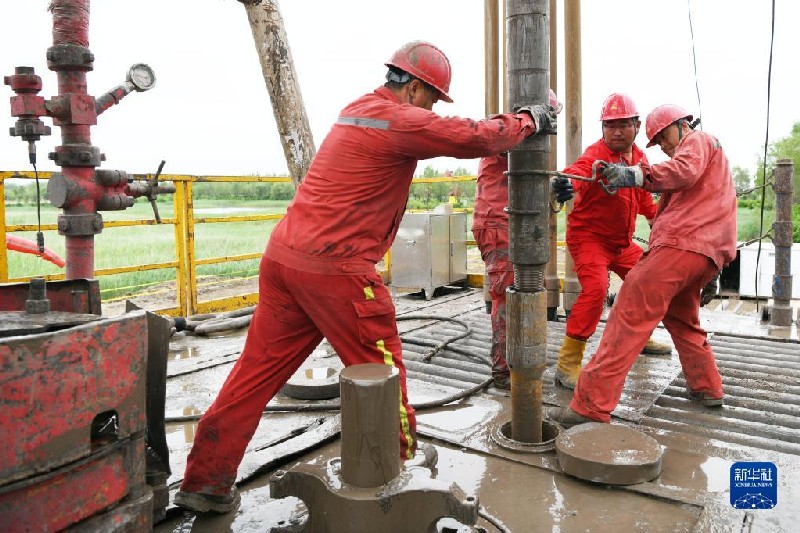 2019年6月27日,大慶油田1205鉆井隊(duì)隊(duì)長張晶(右二)與工人們在進(jìn)行作業(yè)。新華社記者 王建威 攝