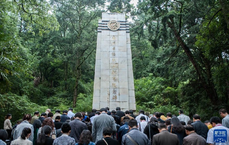 參加南洋華僑機工抗日紀念碑瞻仰活動的全體人員在云南省昆明市西山森林公園的南洋華僑機工抗日紀念碑前默哀(2015年9月8日攝)。新華社記者 呂帥 攝