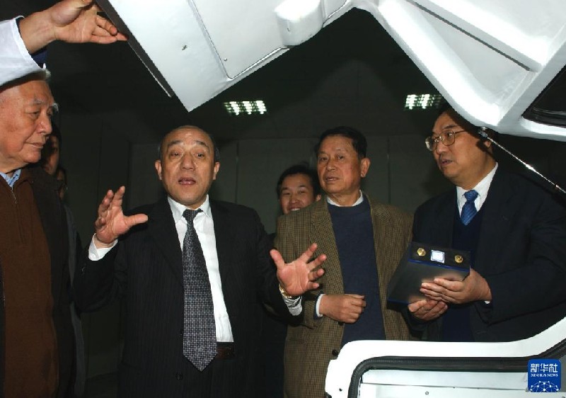 魯冠球(左二)向參觀者介紹萬向集團研發(fā)電動汽車的情況(資料照片)。新華社發(fā)