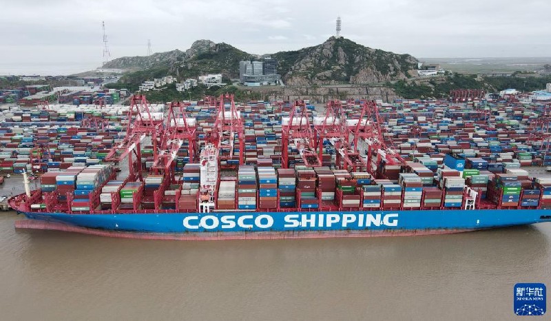 中遠海運“天秤座”輪停泊在上海洋山港二期碼頭(10月13日攝,無人機照片)。新華社記者 方喆 攝