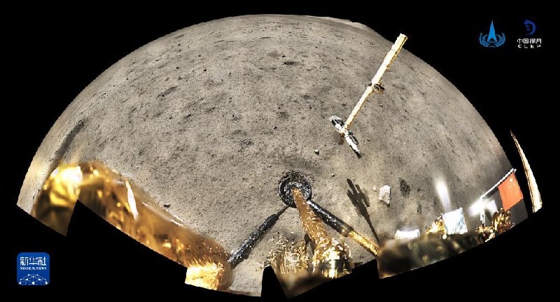 2020年12月4日,國家航天局公布了探月工程嫦娥五號探測器在月球表面國旗展示的照片。嫦娥五號著陸器和上升器組合體全景相機環(huán)拍成像,五星紅旗在月面成功展開,此外圖像上方可見已完成表取采樣的機械臂及采樣器。新華社發(fā)(國家航天局供圖)