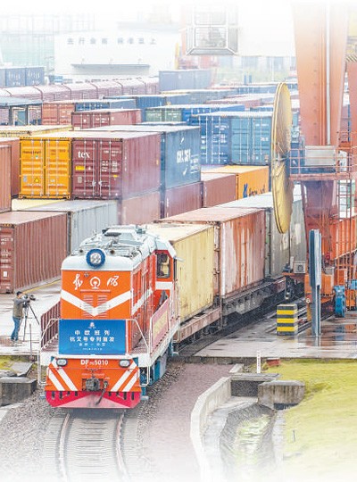 11月22日,X9216/5次“杭叉號(hào)”中歐班列從浙江金華南站啟程,經(jīng)霍爾果斯出境,駛向哈薩克斯坦的梅杰烏。胡肖飛攝(影像中國)