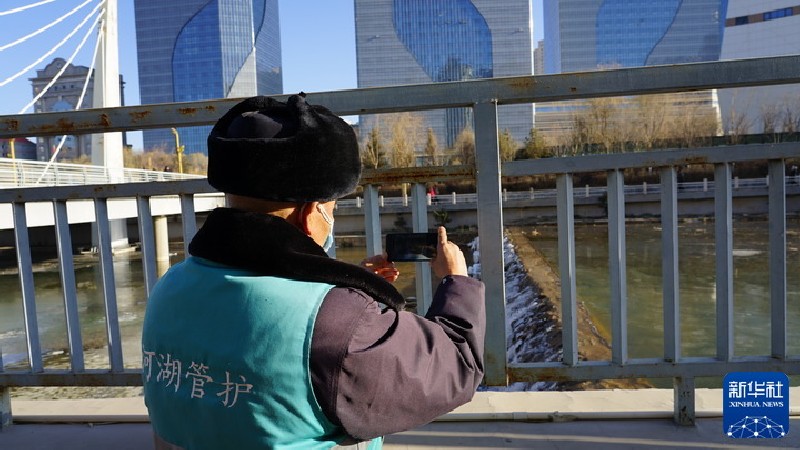 青海省西寧市城西區(qū)興海路街道辦事處河道專職巡查員邵守文在巡河過(guò)程中拍攝照片。(2021年12月13日攝)新華社記者 李寧攝