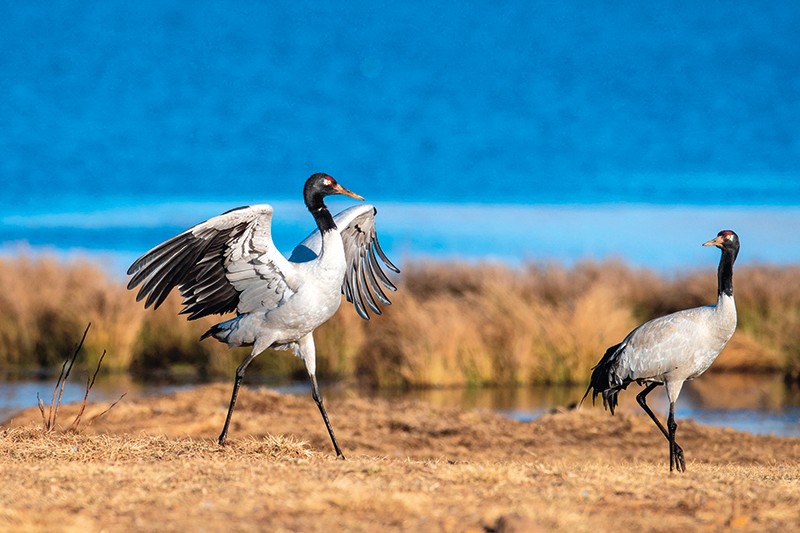 2月24日,黑頸鶴在云南省昭通市大山包大海子濕地嬉戲。新華社記者 胡超 攝