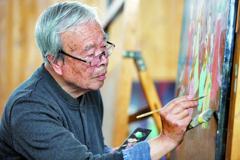 清晨,已滿頭銀發(fā)的薛生金和徒弟們一起在工作室里創(chuàng)作?!懊刻焖匀粓?jiān)持5個(gè)小時(shí)以上的創(chuàng)作。”他的兒子薛曉東說,別人作漆器的裝飾,都是先畫在紙上,再用復(fù)寫紙謄在木胎畫板上,薛生金則多直接用白稿筆在木胎上作畫。