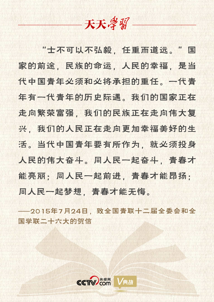 歷史賦予使命,時(shí)代要求擔(dān)當(dāng)。今天,新時(shí)代中國青年處在中華民族發(fā)展的最好時(shí)期,既面臨著難得的建功立業(yè)的人生際遇,也面臨著“天將降大任于斯人”的時(shí)代使命。新時(shí)代中國青年要珍惜這個(gè)時(shí)代,擔(dān)負(fù)時(shí)代使命,在擔(dān)當(dāng)中歷練,在盡責(zé)中成長。只有把人生理想融入國家和民族的事業(yè)中,和人民一起奮斗前進(jìn),才能最終成就一番事業(yè)。