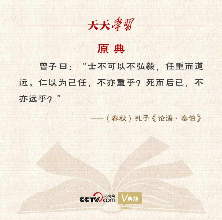 “士不可以不弘毅,任重而道遠(yuǎn)”是《論語·泰伯》中曾子說的一句話。曾子,名參,是孔子弟子之一,在儒學(xué)發(fā)展史上占有重要地位,被后世尊奉為“宗圣”。曾子告訴我們,作為一個(gè)士人,必須志向遠(yuǎn)大,意志堅(jiān)強(qiáng),因?yàn)樗钪约贺?zé)任重大,需要長期艱苦奮斗。朱熹《四書集注》解釋說:“非弘不能勝其重,非毅無以致其遠(yuǎn)。”因此,弘而不毅,固難持久;毅而不弘,則氣量褊狹;既弘且毅,方能任重道遠(yuǎn)。