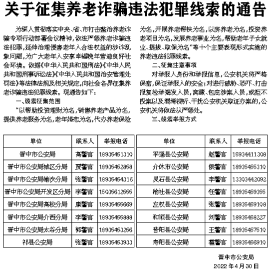 關(guān)于征集養(yǎng)老詐騙違法犯罪線索的通告
