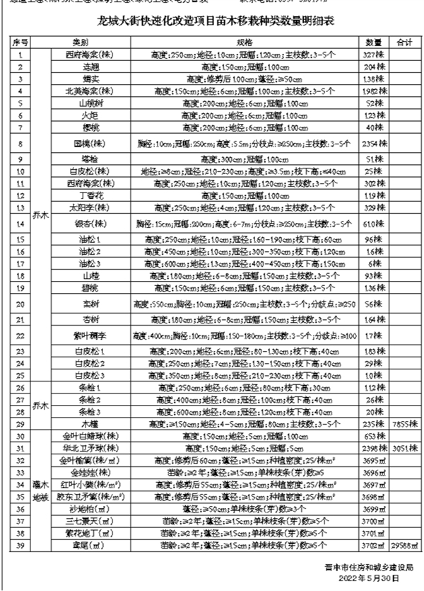 為扎實推進太原晉中城市群交通一體化對接進程,完善智創(chuàng)谷周邊路網(wǎng)結(jié)構(gòu),經(jīng)晉中市人民政府批準,擬實施龍城大街快速化改造項目。該項目西起太榆交界,東至中都北路以西,紅線寬60 米、綠線寬 90 米,雙向十車道(主線雙向六車道、輔道雙向四車道),沿線建設(shè)單節(jié)點高架橋 3 座(新建路節(jié)點、預(yù)留東環(huán)線南延節(jié)點、民航路節(jié)點)、連續(xù)高架橋 1 座(連續(xù)上跨魏榆路、縱九路)、下穿通道 1 座(魏榆路節(jié)點)、匝道高架橋 1 座(魏榆路節(jié)點)。主要建設(shè)內(nèi)容包括:道路工程、橋梁工程、通道工程、雨污水工程、照明工程、綠化工程、電力管線土建工程以及交通安全設(shè)施配套工程等。根據(jù)項目建設(shè)需要,需對項目紅線范圍內(nèi)及周邊部分苗木進行移栽。移栽地點:晉中市城區(qū)道路、公園、游園和綠地。根據(jù)《山西省城市綠化實施辦法》(山西省人民政府第296號令)第十四條規(guī)定,現(xiàn)就項目涉及苗木移栽事宜予以公告。