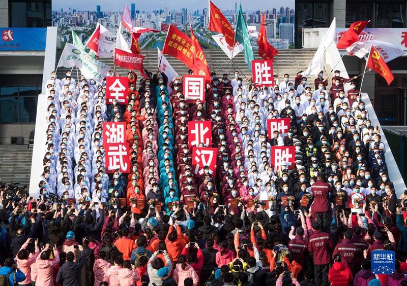 2020年3月10日,醫(yī)護人員在武昌方艙醫(yī)院前慶祝。當日,武漢所有方艙醫(yī)院全部休艙。新華社記者 肖藝九 攝
