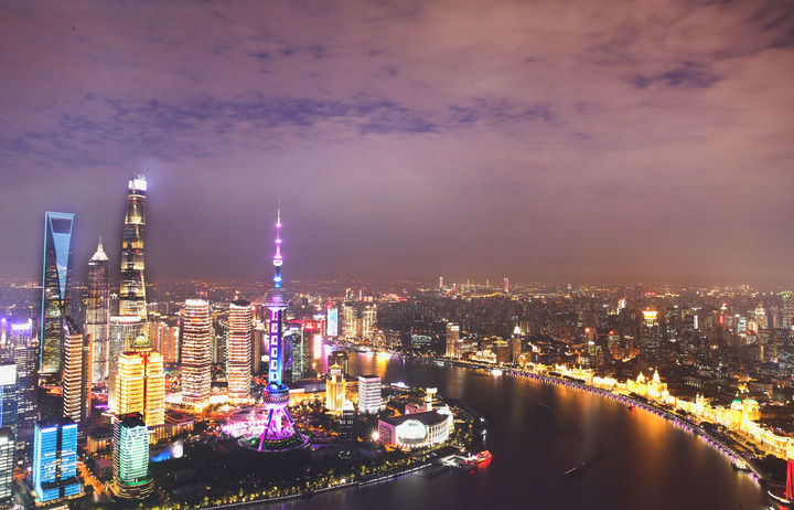從上海白玉蘭廣場(chǎng)頂樓俯瞰浦東陸家嘴夜色(2020年10月18日攝,多重曝光圖)。新華社記者 方喆 攝