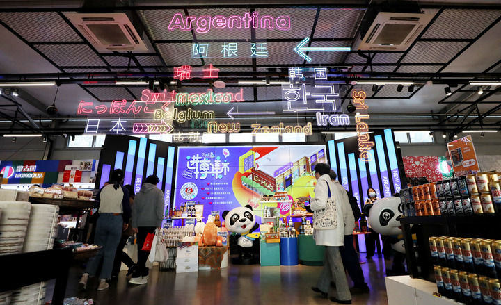 在上海市南京路上的進(jìn)博集市內(nèi),顧客們走在一處各國(guó)商品集中展示臺(tái)前(2021年11月8日攝)。新華社記者 方喆 攝