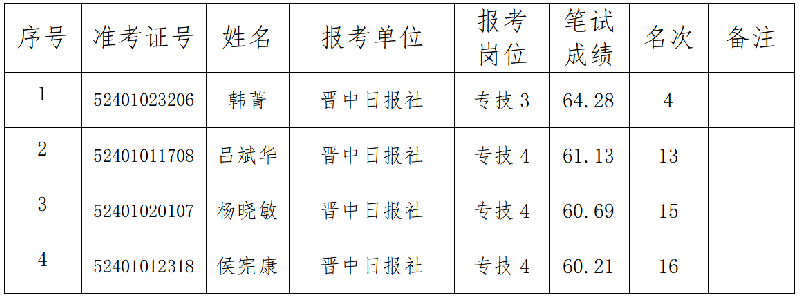 ?? 晉中日報(bào)社2022年公開招聘工作人員資格復(fù)審工作已于8月3日結(jié)束,因晉中日報(bào)社專技3崗位1名考生放棄資格復(fù)審,專技4崗位3名考生放棄資格復(fù)審,以上崗位按筆試成績從高分到低分的順序,依次遞補(bǔ)入闈資格復(fù)審人員,名單如下: