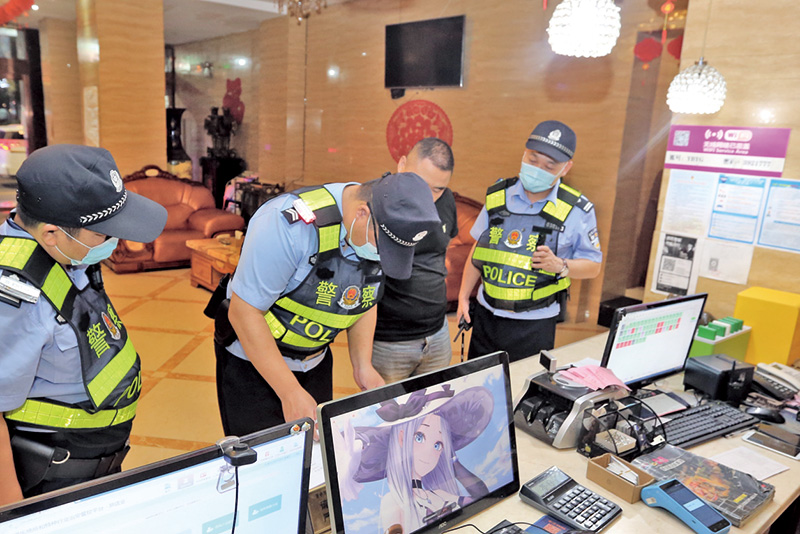 市公安局城區(qū)分局西南街派出所民警在某快捷酒店進(jìn)行安全檢查。