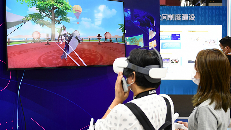 28日,2022年中國(guó)網(wǎng)絡(luò)文明大會(huì)在國(guó)家會(huì)展中心(天津)拉開帷幕,參觀者在廣東館通過VR體驗(yàn)洪拳。(圖片來源:CFP)