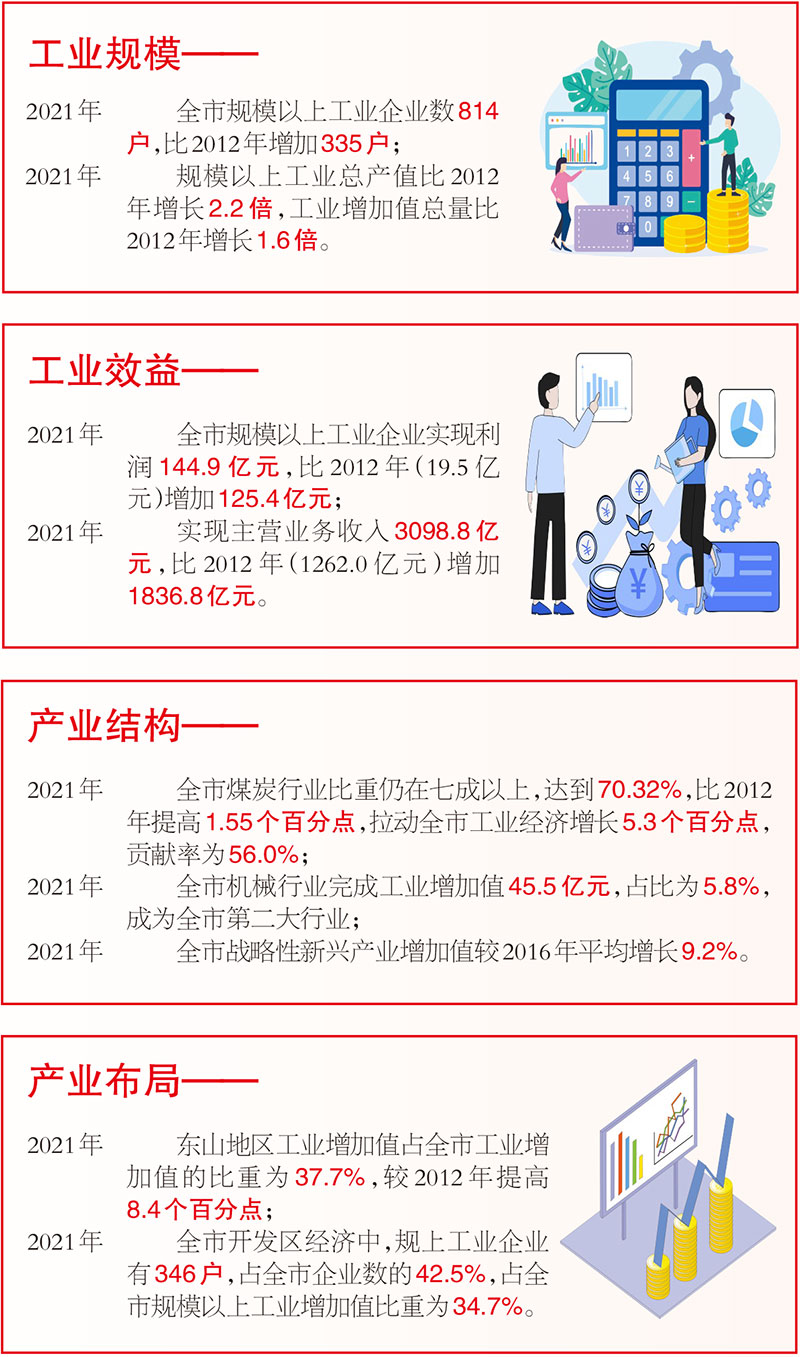 ——煤炭產(chǎn)業(yè)仍是有力支撐。2021年,全市煤炭行業(yè)比重仍在七成以上,達(dá)到70.32%,比2012年提高1.55個(gè)百分點(diǎn),拉動(dòng)全市工業(yè)經(jīng)濟(jì)增長(zhǎng)5.3個(gè)百分點(diǎn),貢獻(xiàn)率為56.0%,貢獻(xiàn)突出,支撐明顯,對(duì)我市工業(yè)的穩(wěn)定性和拉動(dòng)性至關(guān)重要。