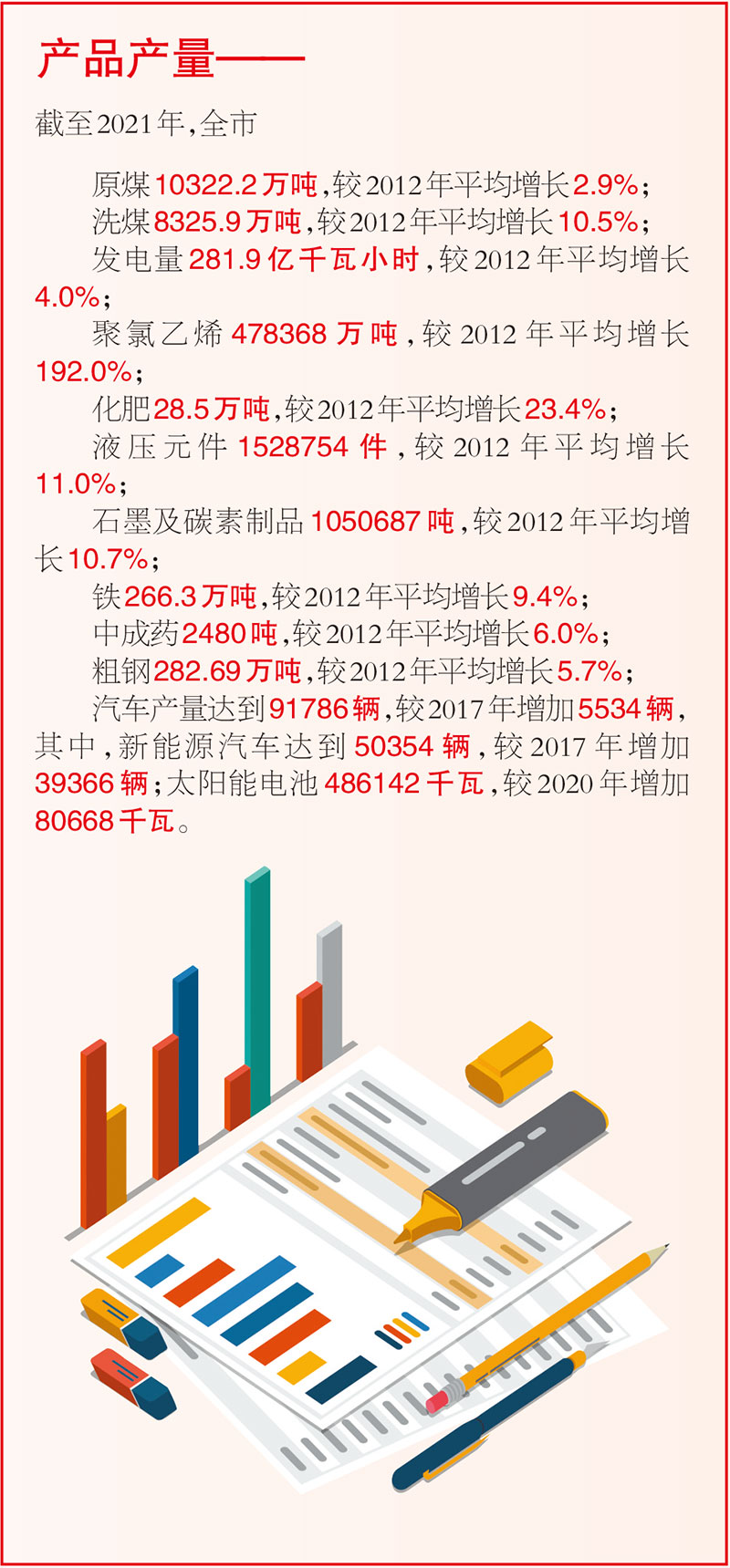 黨的十八大以來(lái),全市工業(yè)產(chǎn)品產(chǎn)量大幅增長(zhǎng),產(chǎn)品質(zhì)量明顯提高。其中,原煤10322.2萬(wàn)噸,較2012年平均增長(zhǎng)2.9%;洗煤8325.9萬(wàn)噸,較2012年平均增長(zhǎng)10.5%;發(fā)電量281.9億千瓦小時(shí),較2012年平均增長(zhǎng)4.0%;聚氯乙烯478368萬(wàn)噸,較2012年平均增長(zhǎng)192.0%;化肥28.5萬(wàn)噸,較2012年平均增長(zhǎng)23.4%;液壓元件1528754件,較2012年平均增長(zhǎng)11.0%;石墨及碳素制品1050687噸,較2012年平均增長(zhǎng)10.7%;鐵266.3萬(wàn)噸,較2012年平均增長(zhǎng)9.4%;中成藥2480噸,較2012年平均增長(zhǎng)6.0%;粗鋼282.69萬(wàn)噸,較2012年平均增長(zhǎng)5.7%。很多產(chǎn)品經(jīng)歷了從無(wú)到有,從小到大。隨著吉利汽車、新能源汽車的相繼推出,2021年汽車產(chǎn)量達(dá)到91786輛,較2017年(86252輛)增加5534輛,其中,新能源汽車達(dá)到50354輛,較2017年(10988輛)增加39366輛;太陽(yáng)能電池2021年486142千瓦,較2020年(405474千瓦)增加80668千瓦。