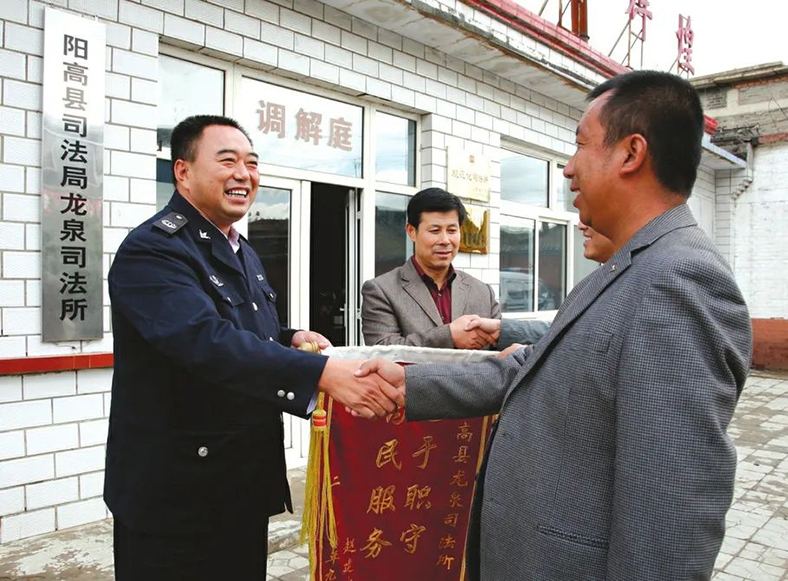 “這位被當(dāng)?shù)厝罕娪H切地譽(yù)為‘李司法’的人,名叫李培斌。在大同市陽高縣,百姓口中流傳著一句‘有困難,找培斌’的順口溜。圖片上,滿心歡喜的群眾向李培斌贈(zèng)送錦旗,錦旗上寫著‘忠于職守,為民服務(wù)’8個(gè)大字?!表樦v解員魏佳的指引,觀眾們走進(jìn)“時(shí)代楷?!崩钆啾蟮墓适隆?/p>