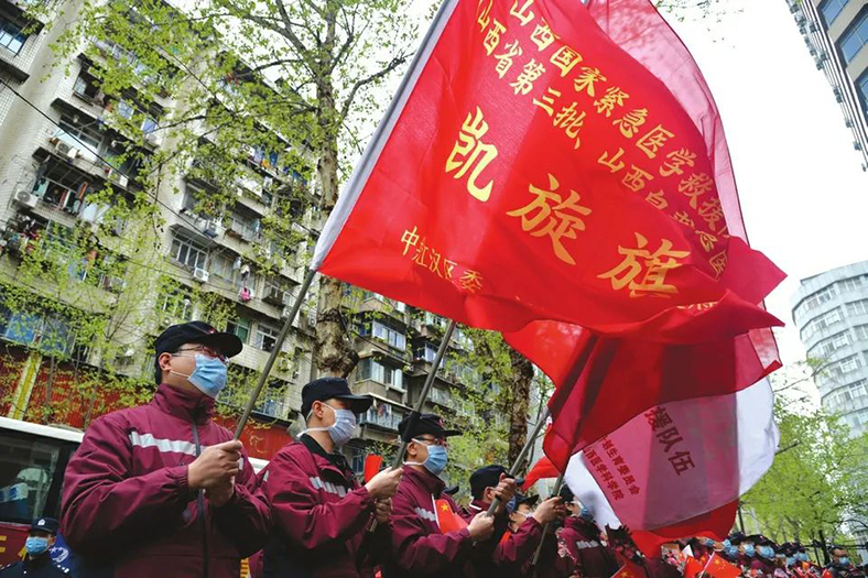 ▲面對(duì)突如其來的新冠肺炎疫情,山西省先后派出13批1516名醫(yī)護(hù)人員支援湖北,其中共產(chǎn)黨員583名,火線入黨342名。圖為2020年3月,湖北省武漢市江漢區(qū)委、區(qū)政府贈(zèng)授給山西國(guó)家緊急醫(yī)學(xué)救援隊(duì)凱旋旗。