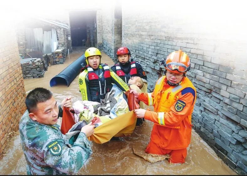 ▲充分發(fā)揮基層黨組織戰(zhàn)斗堡壘作用和共產(chǎn)黨員先鋒模范作用,危難之際沖鋒在前。圖為山西省祁縣黨員干部在洪災(zāi)搶險(xiǎn)一線救助受困群眾。