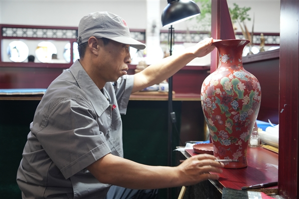 工人為推光漆瓶描金