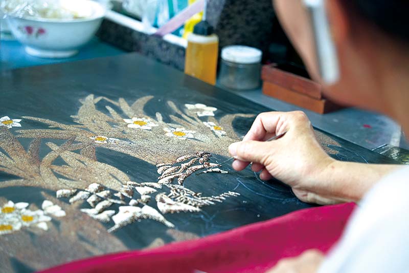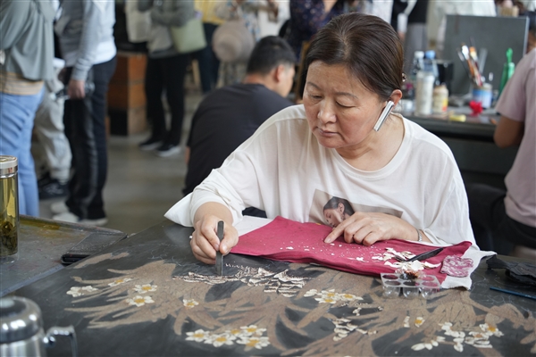 工藝美術(shù)大師將雞蛋殼融入推光漆器制作工藝,創(chuàng)新制作出新的推光漆工藝品。