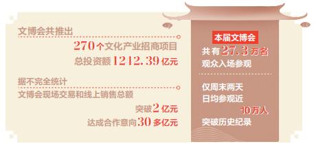 突出項目帶動,文化交易持續(xù)增強。本屆文博會充分發(fā)揮展會在產(chǎn)業(yè)交流、項目合作、招商推介等方面的平臺作用,將洽談交易與文化博覽相互融合,吸引了省內(nèi)外文化產(chǎn)業(yè)界的廣泛關(guān)注和參與,體現(xiàn)了我省文化產(chǎn)業(yè)的良好發(fā)展態(tài)勢,也展示了文博會這一交流貿(mào)易平臺釋放的巨大能量。文博會共推出270個文化產(chǎn)業(yè)招商項目,總投資額1242.39億元。據(jù)不完全統(tǒng)計,文博會現(xiàn)場交易和線上銷售總額突破2億元,達成合作意向30多億元。