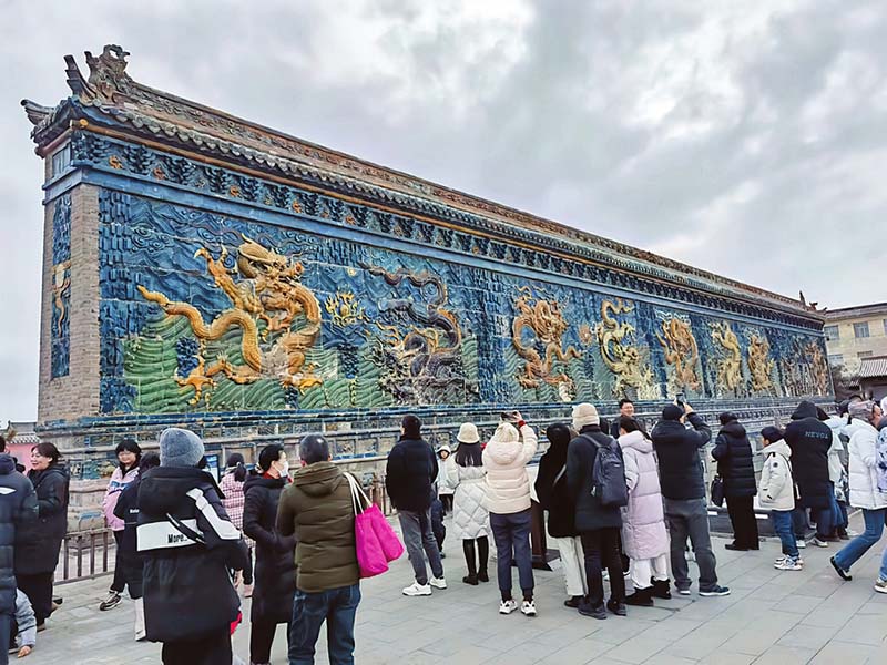 游人在大同市古城琉璃九龍壁前游玩 池茂花攝