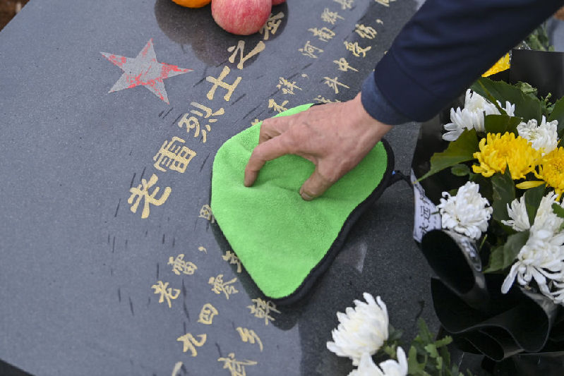 4月3日,在位于武鄉(xiāng)縣里莊村的八路軍烈士陵園,梁效珍擦拭雷姓烈士墓碑上的塵土。新華社記者 楊晨光 攝