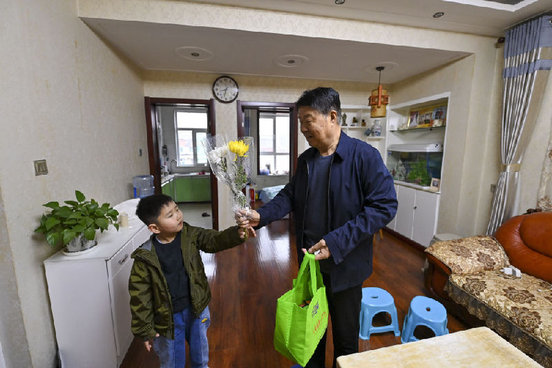 4月3日,梁效珍(右)在出發(fā)前把為烈士準備的鮮花遞給重外孫楊崇顥。新華社記者 楊晨光 攝
