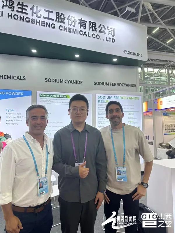 圖為山西鴻生化工股份有限公司展位負(fù)責(zé)人張晉強(qiáng)與境外采購商合影。