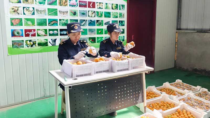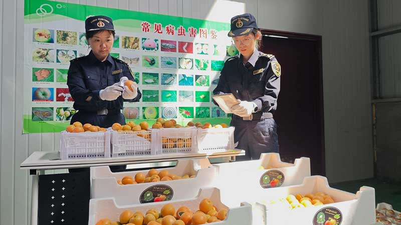 ▲太原海關(guān)所屬運(yùn)城海關(guān)關(guān)員對(duì)出口鮮杏開(kāi)展現(xiàn)場(chǎng)查驗(yàn)