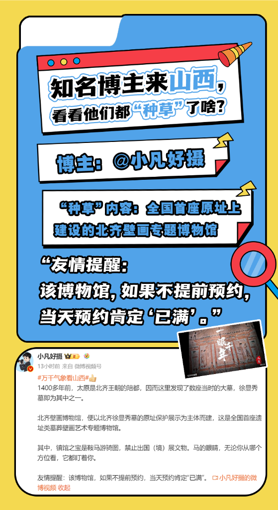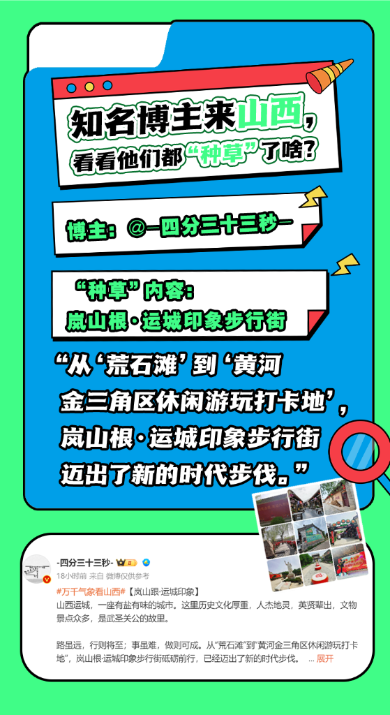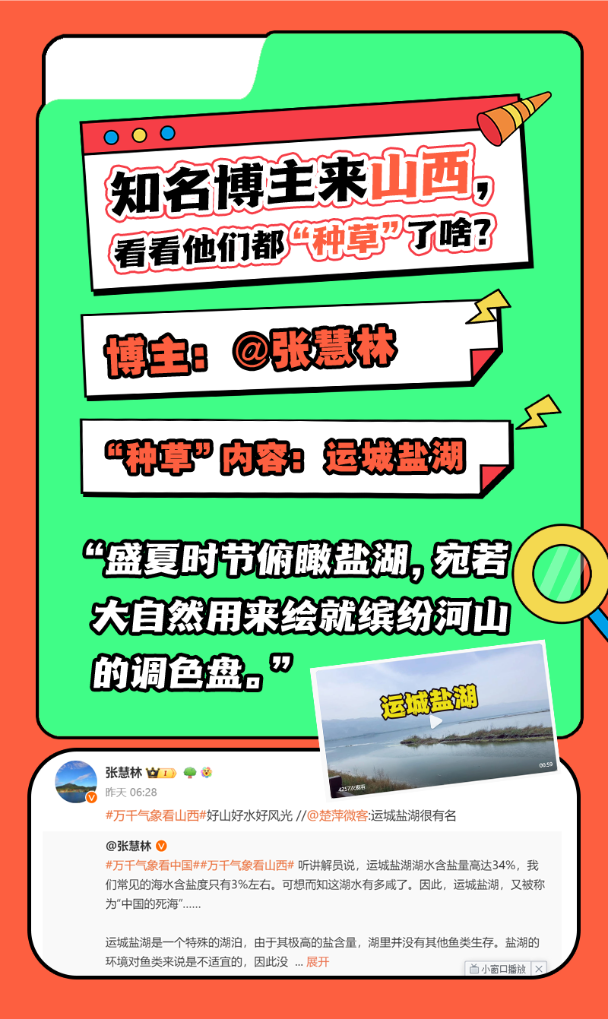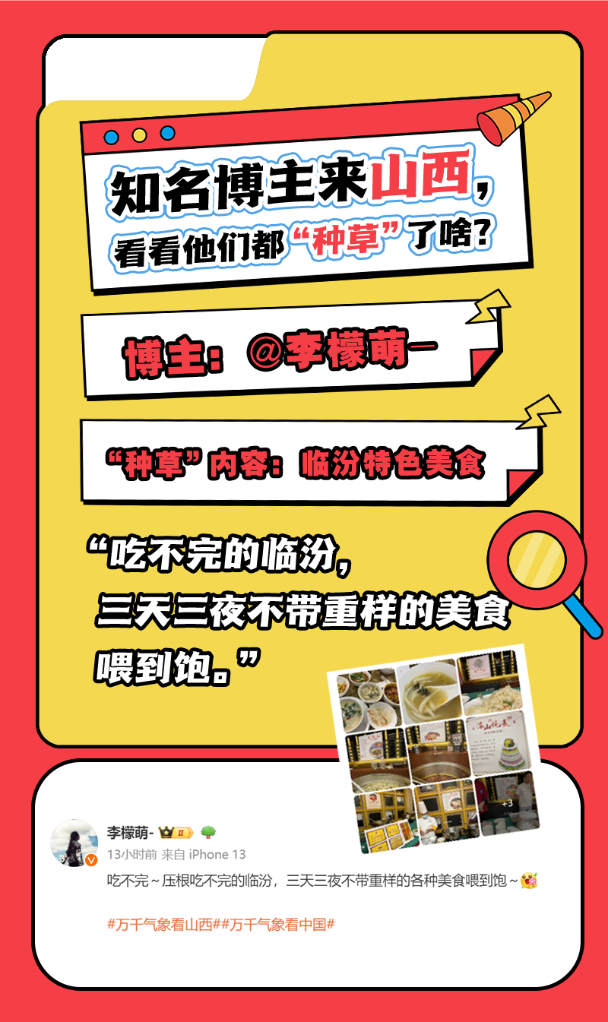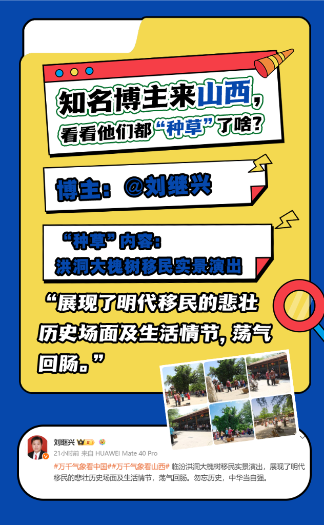 在近日舉辦的“中國式現(xiàn)代化的萬千氣象”網(wǎng)絡名人山西行活動中,來自全國的知名博主相聚山西,共同見證山西現(xiàn)代化的發(fā)展成果。通過一組海報,看看他們都“種草”了啥?