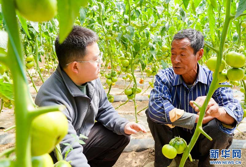 中國(guó)農(nóng)業(yè)大學(xué)博士研究生王樂(lè)(左)正在指導(dǎo)村民進(jìn)行田間管護(hù)。新華網(wǎng) 發(fā)(張宗昌 攝)