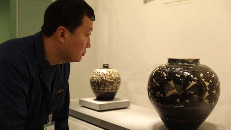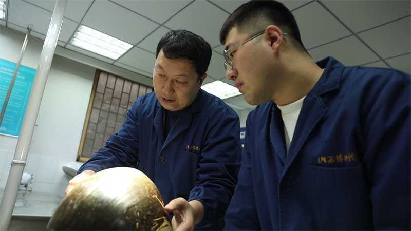 續(xù)凱仔細(xì)端詳自己修復(fù)過的文物。(視頻截圖)