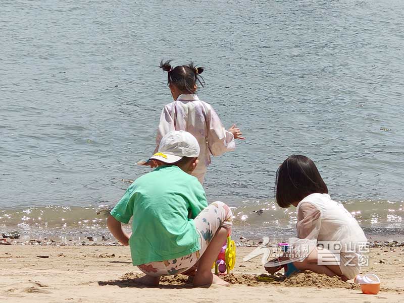 陽光沙灘上,三個孩童盡情嬉戲。