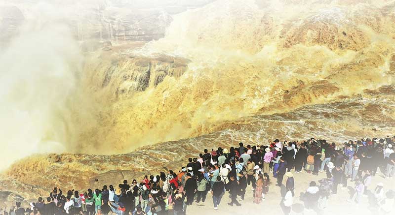 “壺口”的稱謂,最早見(jiàn)于《尚書(shū)·禹貢》中,如“既載壺口,治梁及岐”“壺口、雷首,至于太岳”,都與傳說(shuō)中大禹治水的路線與策略有關(guān),壺口是大禹治水的始發(fā)之地。黃河壺口瀑布旅游區(qū)是國(guó)家5A級(jí)旅游景區(qū),是中國(guó)第二大瀑布,全世界最大的黃色瀑布。站在壺口觀景臺(tái)往上看,只見(jiàn)洶涌的黃河水簇?fù)碇?、吶喊著撲到眼前,其?shì)如千軍萬(wàn)馬,漫山遍野般涌來(lái),到了壺口,那一排排的巨浪在翻著水花馳騁飛奔中,突然墜入深坑,發(fā)出了震耳的嘶鳴聲,濺起了漫天水霧,再簇?fù)碇枷蜻h(yuǎn)方……而此時(shí)的你,只會(huì)感覺(jué)到大自然的偉岸和自己的渺小。