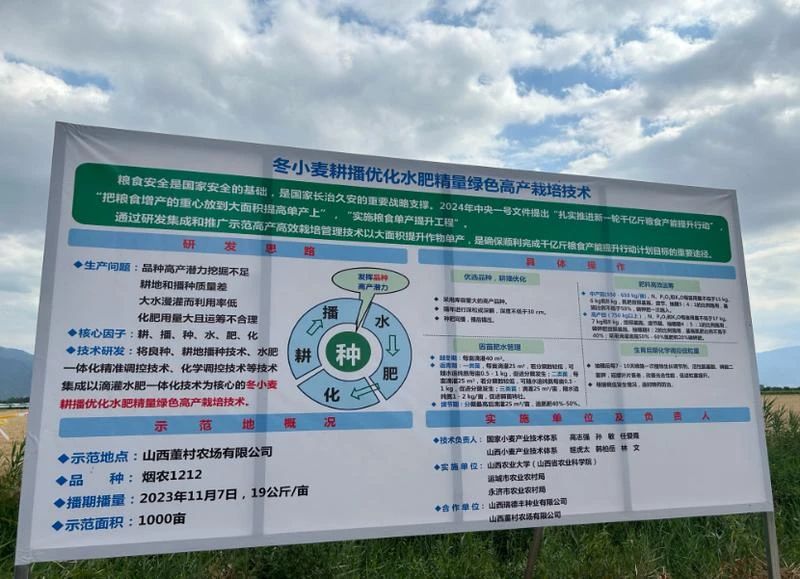 當(dāng)天的測產(chǎn)示范田位于運城市永濟市山西董村農(nóng)場有限公司,該公司擁有小麥面積約17000畝,其中噴灌面積約12000畝,滴灌面積約6000畝。山西農(nóng)業(yè)大學(xué)高志強教授團隊研發(fā)集成的“耕播優(yōu)化水肥精量綠色高產(chǎn)栽培技術(shù)”核心示范田面積160畝。示范田品種煙農(nóng)1212,2023年11月7日播種,播量19公斤/畝,采用德國雷肯小麥播種機密行稀播。返青后、拔節(jié)期、灌漿期均采用水肥一體化滴管方式精準給水給肥,中后期進行病蟲害防治,灌漿期噴施植物生長調(diào)節(jié)劑增強抗逆性、促進粒重增加。